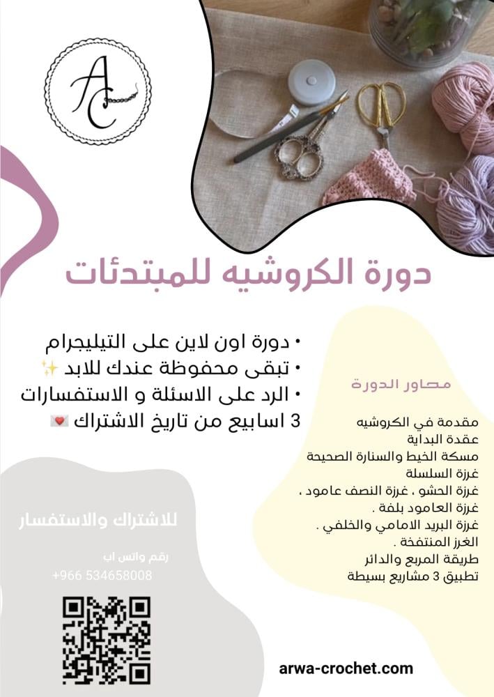هل تحبين الكروشيه وتودين تعلم الأساسيات أو تطوير مهاراتك؟ انضمي لدورتنا الخاصة بفن الكروشيه وتعلمي أسرار هذا الفن الجميل من الصفر حتى الاحتراف. مع مدربة محترفة، ستتعلمين كل خطوة بدقة لتصنعين أجمل القطع اليدوية بنفسك! 🌟